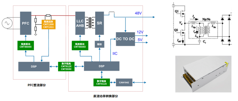 在PFC整流部分与直流功率转换部分之间,数字隔离器CMT812X/CMT804X主要用于实现原边控制电路与副边控制电路之间的电气隔离,可进一步完善整个电源系统的隔离防护体系。