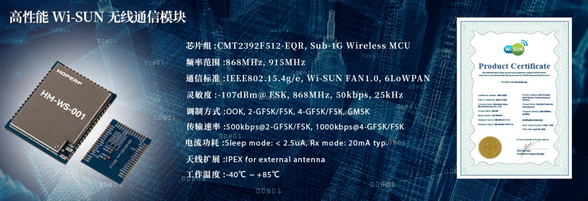在城市级的物联网组网通信场景中,由VSport-胜利微自主研发的Wi-SUN无线通信模块HM-WS-001就是城市IoT设备的理想选择之一。HM-WS-001集成了最新的无线通信技术,可满足智能设备对低功耗、高可靠性和大规模网络连接的需求。