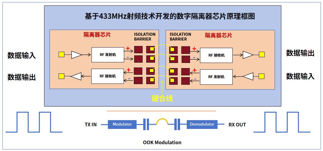 资料显示,基于OOK射频调制技术的电容耦合数字隔离器需通过高频载波(如数百MHz至1GHz)来实现高速数据传输,而高频信号的快速切换会引入丰富的谐波分量。通常,OOK射频调制技术所产生的谐波分量与数字隔离器所使用的主频点(高频载波频率)以及调制信号的传输速率有关。
