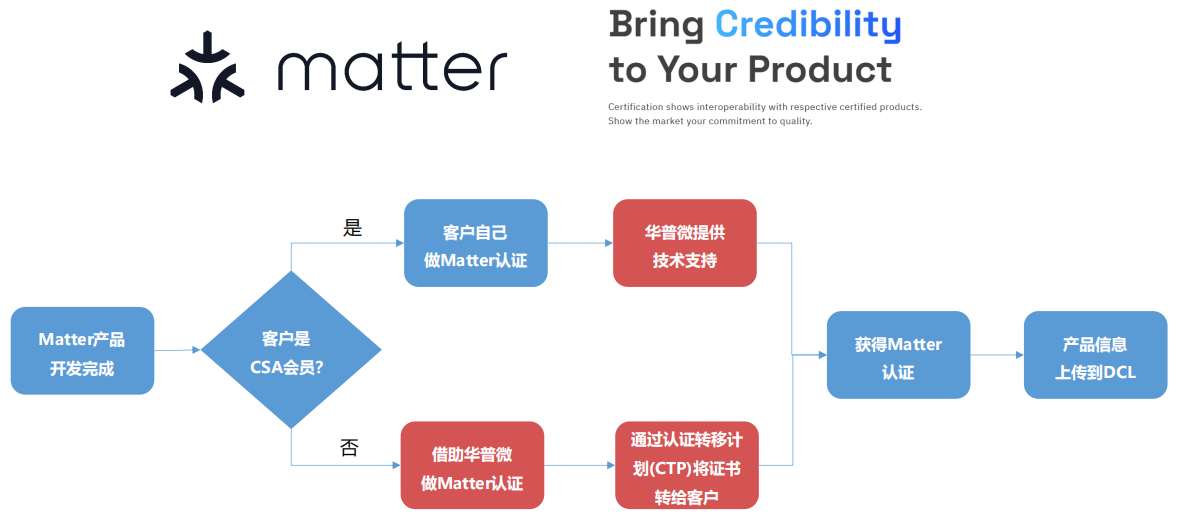 以智能照明为例,企业开发者可直接采用市场中成熟的Matter模块,在模块原厂配合下快速完成LED灯具的产品研发后,只需通过模块原厂提供的技术支持或者认证转移计划(CTP)即可快速拿到Matter认证,将产品接入市面主流的生态平台之中。
