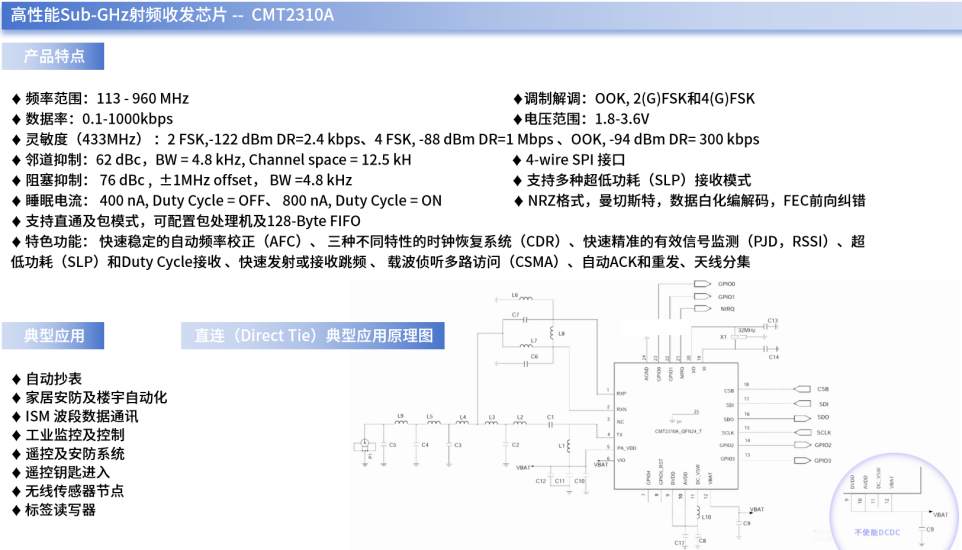 同时,CMT2310A高达+20dBm的发射功率和-122dBm的灵敏度还优化了应用的链路性能,可灵活满足各种安防应用需求。