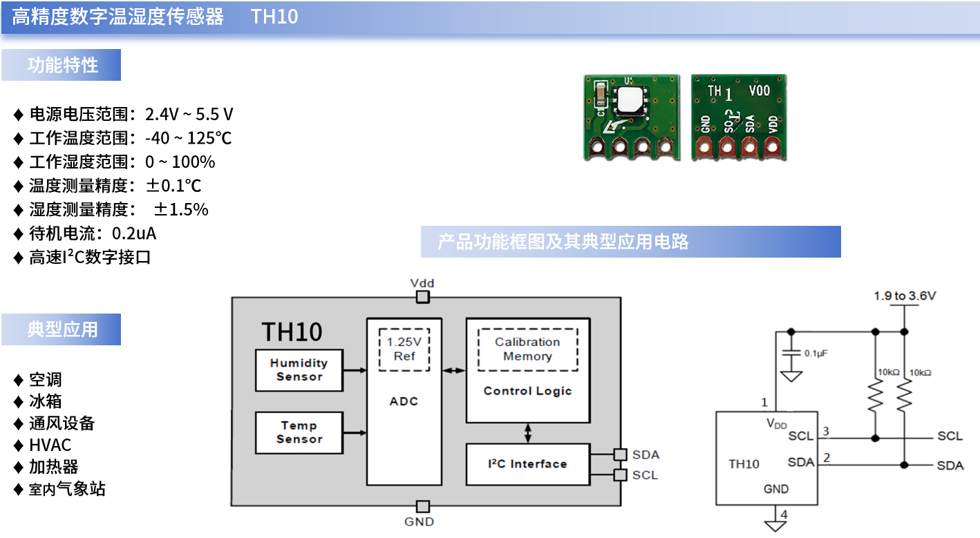 TH10是一款高精度的数字温湿度传感器,内部集成了模数转换器,信号处理,校准参数和I2C数字通信接口,具有低功耗、低漂移、低迟滞,以及出色的长期稳定性等特点。